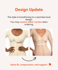 This Stage 1 recovery garment features a front hook-and-eye closure with three adjustable rows, a built-in surgical compression bra, below-the-elbow sleeves, and a high back for added posture and upper body support. An open crotch ensures easy wear after surgery.